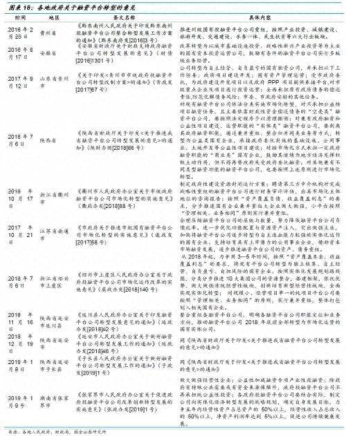 目前,陕西省、山东省、江苏省、浙江省都分别出台了平台转型的意见,我们从中选取了2个最具有代表性的文件来说明政府角度应如何实现平台公司转型。具体各地的转型相关文件见图表18。