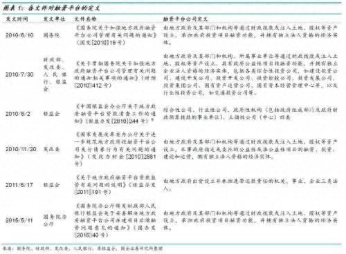 融资平台的来龙去脉。最初融资平台的概念主要突出其地方国企属性,以及承担政府投资项目融资的职能,之后政策强调融资平台具有政府公益性项目投融资功能,“公益性项目”又进一步完善成“公益性或准公益性项目”。为了加深理解,我们尝试从股权、平台职能、平台名单三个方面对融资平台的概念进行再探究,但是发现融资平台的定义仍不太明晰。最终我们仍采用融资平台的广义概念,即融资平台是由地方政府及其部门和机构等通过财政拨款或注入土地、股权等资产设立,承担政府投资项目融资功能,并拥有独立法人资格的经济实体。