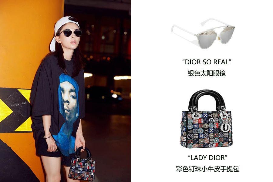 虽然是随性自在的一套出街look,但价值可不菲哦!墨镜同样也是来自Dior的“DIOR SO REAL”银色太阳眼镜,以新颖pantos造型为特色,将建筑线条与高级定制时装理念完美融合。包包则是Dior品牌标志性的Lady Dior手提包的小号2016彩色钉珠新款哦!是不是超有钱又有品,不过这画风一变王子文居然穿了一件黑色人像印花大棉T,实在太有个性!