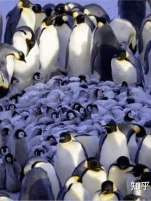 32、企鹅抱团取暖时,企鹅群会保持一定速度的小碎步慢慢移动,外层的企鹅每隔半分钟左右就会慢慢地挪到里面去,所以不会出现外层企鹅冻死的情况。