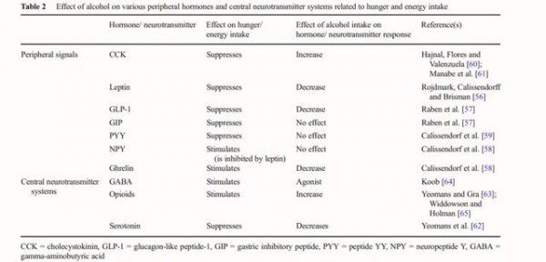 酒精会抑制的各种神经信号和代谢激素(Traversy,2015)