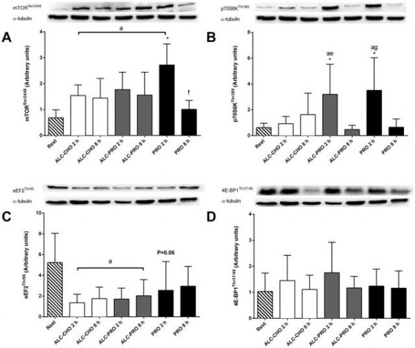黑条是你练完喝粉的正常肌蛋白合成效率,白条和灰条分别是练完碳水+酒精、练完蛋白质+酒精。饮酒的实验组,mTOR信号和相应的磷酸激酶都显著被削弱了。(Parr ,2014)