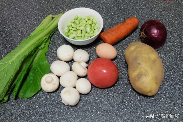 食材准备:有一小碗毛豆粒、半根胡萝卜、一个土豆、半个洋葱、两根小白菜、8粒口蘑、一个番茄、一个鸡蛋,因为做的量不多,所以每种食材只需要少量就可以了。