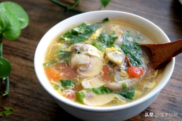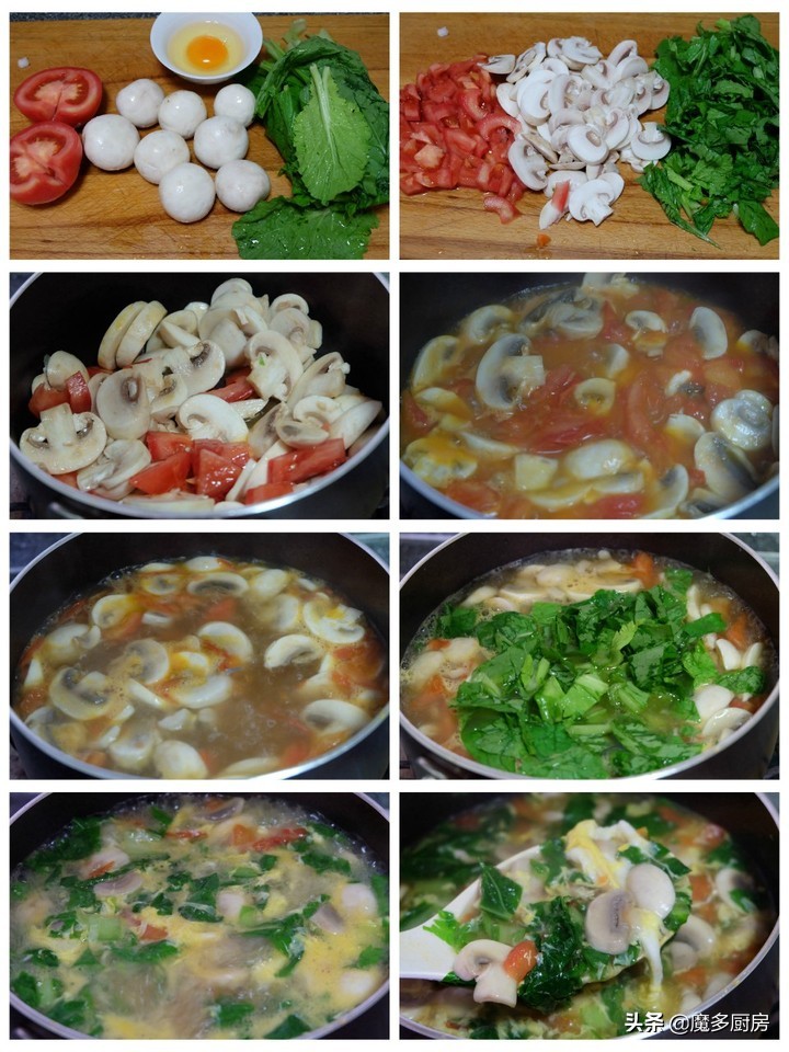 接下来再来看看番茄口蘑鸡蛋汤的做法,口蘑烧汤味道十分的鲜美,加上番茄多了一些酸酸甜甜的味道,鲜味十足又开胃,鸡蛋和小白菜碎一黄一绿,色彩搭配引食诱,这种汤怎么也得喝两碗吧!