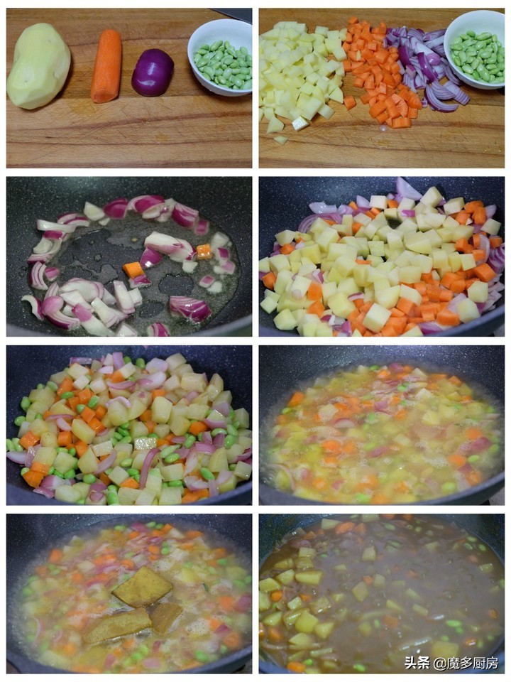 【原料】:一小碗毛豆粒、半根胡萝卜、一个土豆、半个洋葱、半盒咖喱、食用油、热水适量;