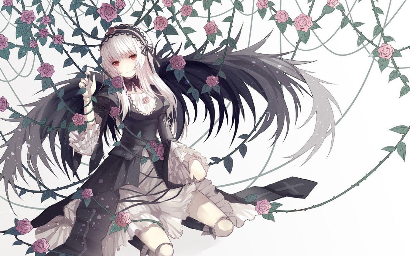 金属感却柔美的银色长发,血红的瞳色。身着哥特风格的服饰(附有逆十字),后背有着黑色的羽翼。服装在配饰上主要使用黑白两色,带有蝴蝶结、丝带、蔷薇等装饰。胸口采用了抹胸设计,白色为底色,其上附有一朵蔷薇,领口以及头饰都采用了丝带和蝴蝶结做点缀。