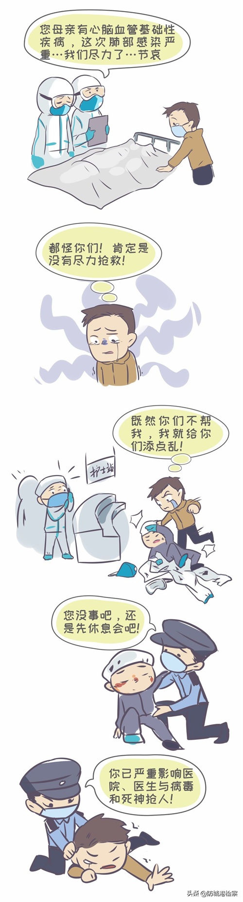 新冠肺炎疫情爆发以来,全国各地医护人员奋勇驰援武汉,让我们看到打赢这场阻击战的希望,但也陆续传来医护人员因感染新冠肺炎去世的消息,让人悲痛。这样一群普通人,一群也是别人的子女、爱人、父母的平凡人,成为和平年代逆行的“生死连”,冲在抗击疫情一线,争分夺秒,护佑我们的生命安全和身体健康。然而,一些患者或者患者家属因不满医疗服务、无法承受亲人离世的打击等原因,发生在医疗场所起哄闹事、对医护人员大打出手的情况,却没有因为病毒的肆虐蔓延、没有因为感恩医生的无私无畏奉献而停止,伤人伤己的犯罪还时有发生。