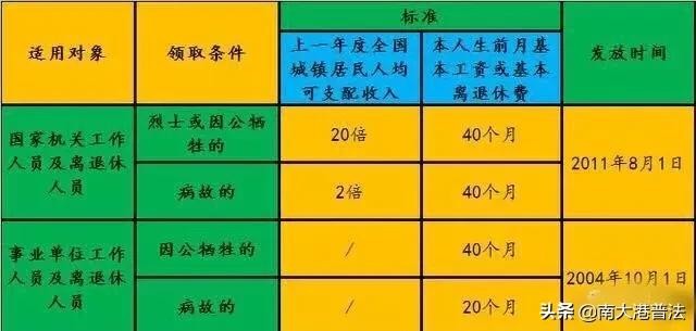 4.除上述情形外,事业单位工作人员和离退休人员死亡一次性抚恤金标准,从2004年10月1日起调整为:因公牺牲为本人生前40个月基本工资或基本离退休费,病故为本人生前20个月基本工资或基本离退休费。烈士的抚恤待遇,按国家有关规定执行。