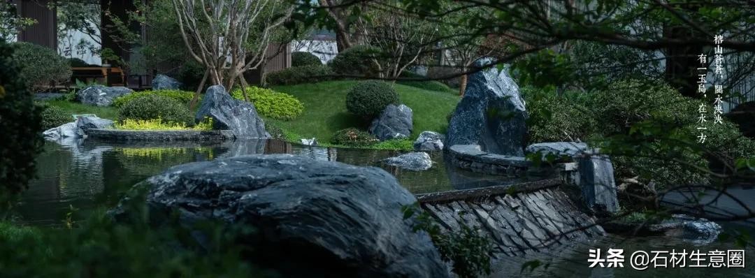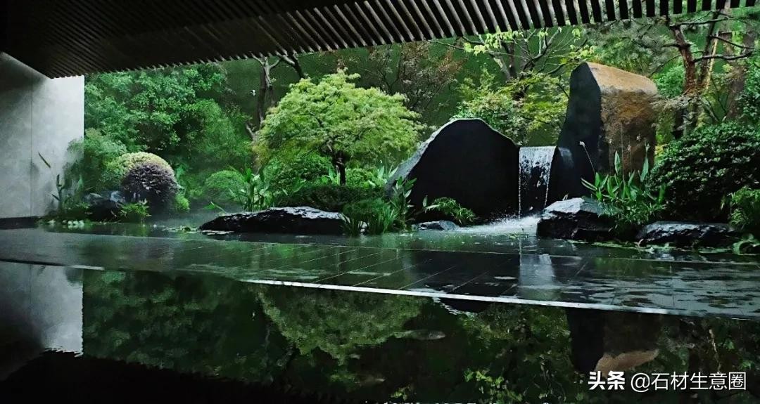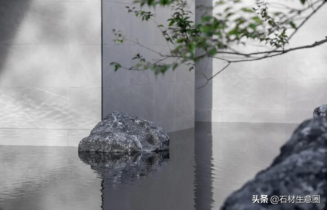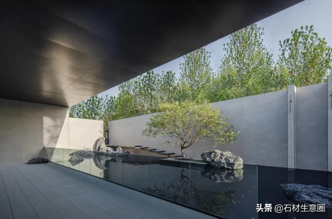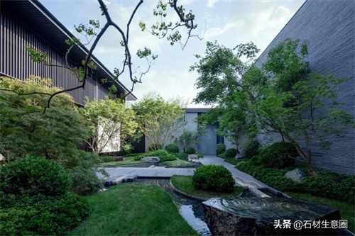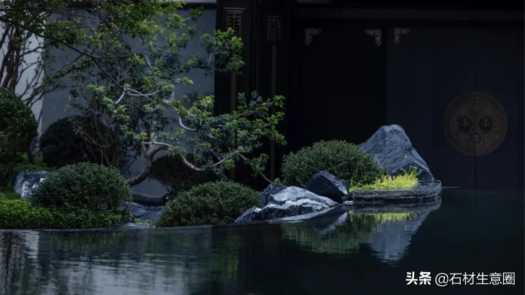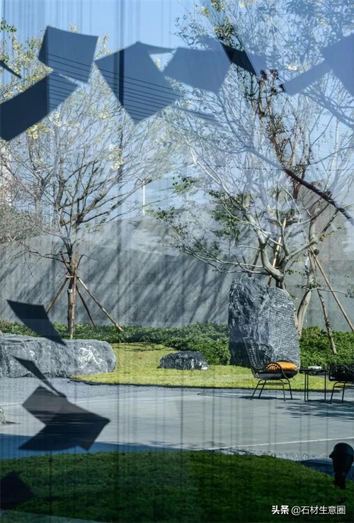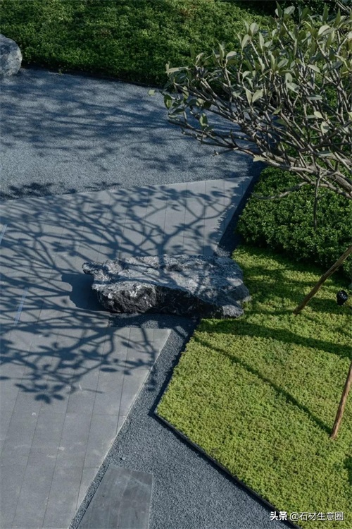 景石点缀水院,有的搭配树木成为了小岛,有的涌出水流成为了源头,有的被小路切割一分为二,坚硬的黑石尝试让水院生动活泼起来,融进了一抹自然。