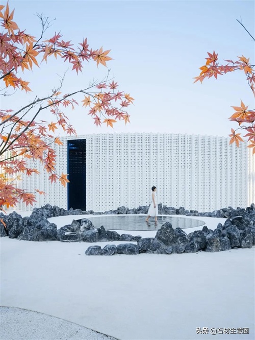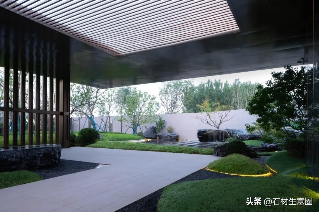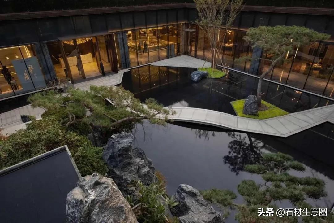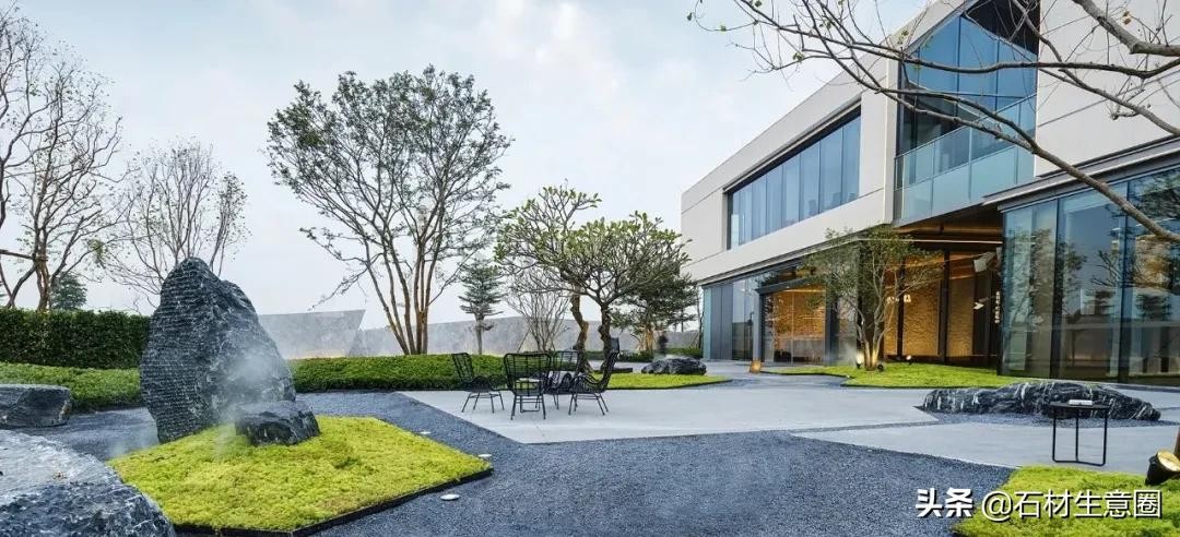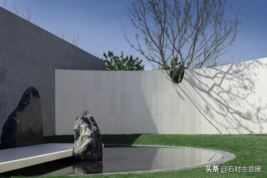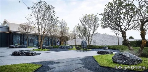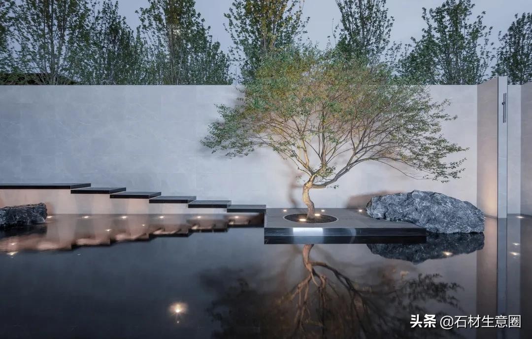 景石点缀水院,有的搭配树木成为了小岛,有的涌出水流成为了源头,有的被小路切割一分为二,坚硬的黑石尝试让水院生动活泼起来,融进了一抹自然。
