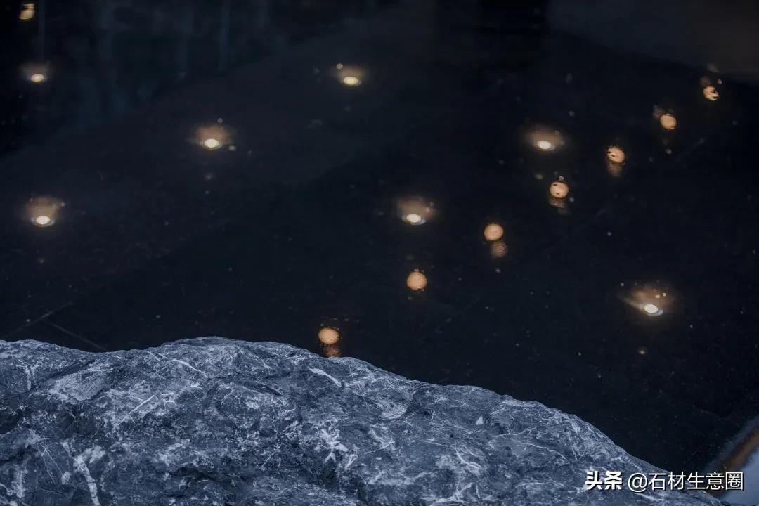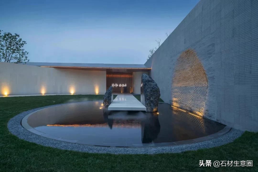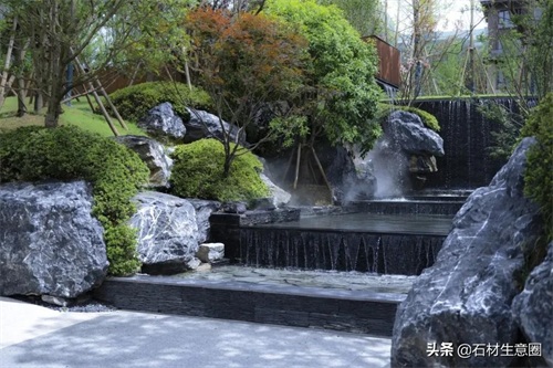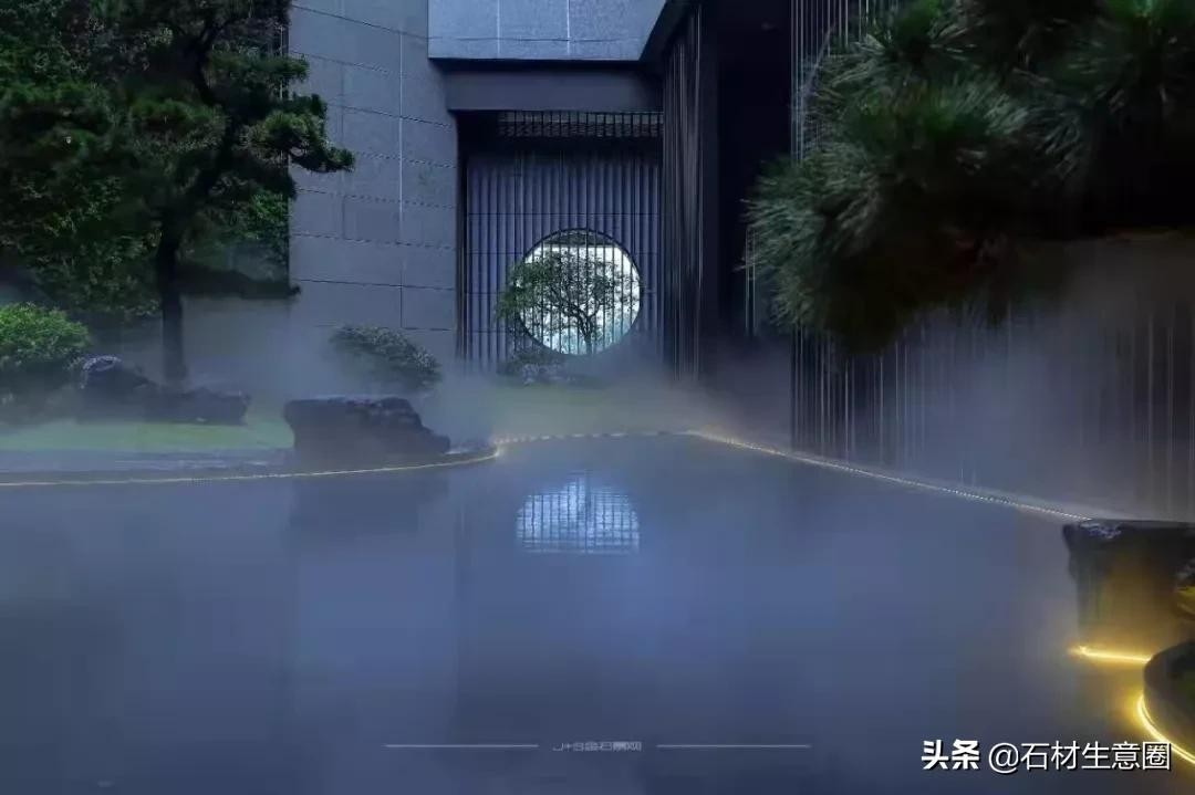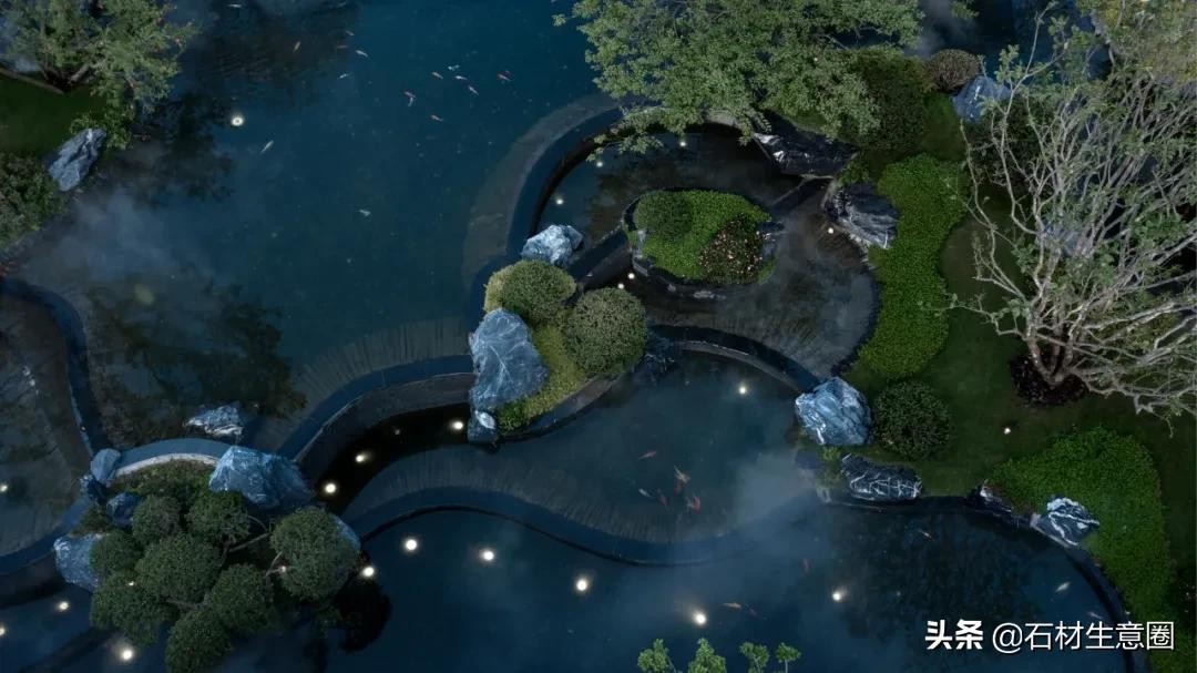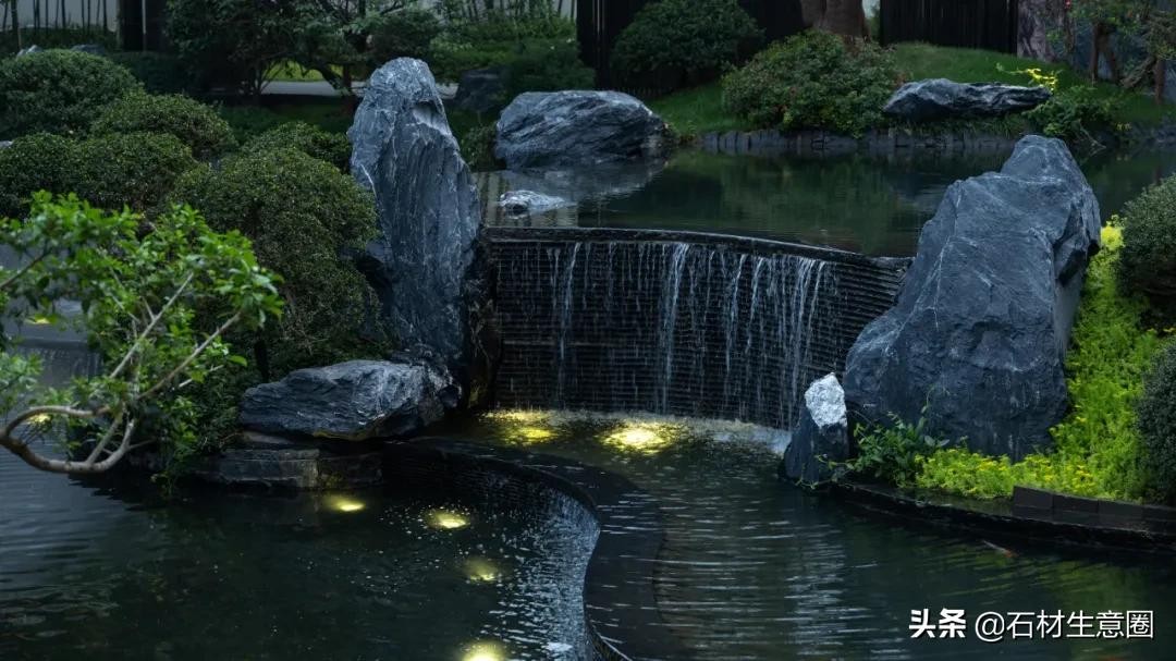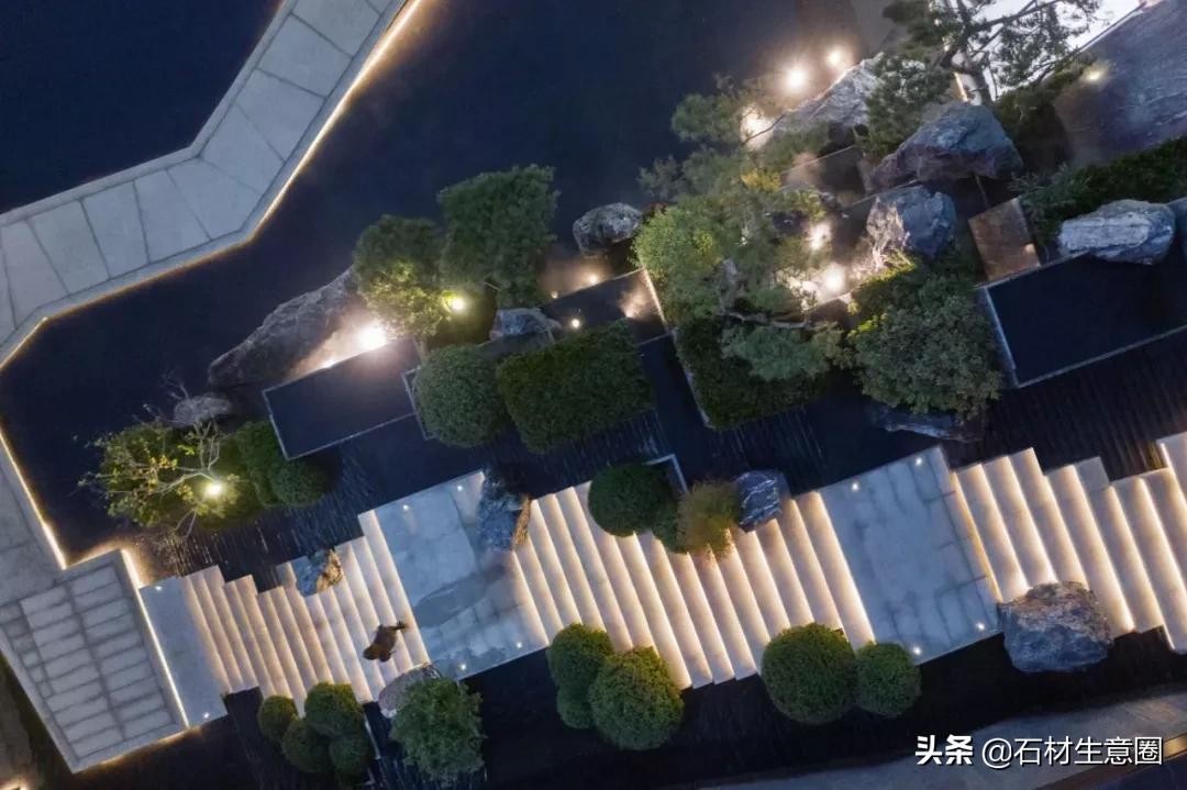 本案最大的施工难度就是多种石景的落地:被小径或玻璃栏杆切分开的水中浮石、跨过水底至平台的巨大点景石、高耸成为护栏的立石,以及作为水景源头的泉石。经历了:选石、切割、现场定型、控制修正、调整重塑等过程。黑山石坚实黝黑,最终演绎了江海岸礁的力量之景。