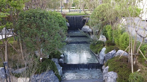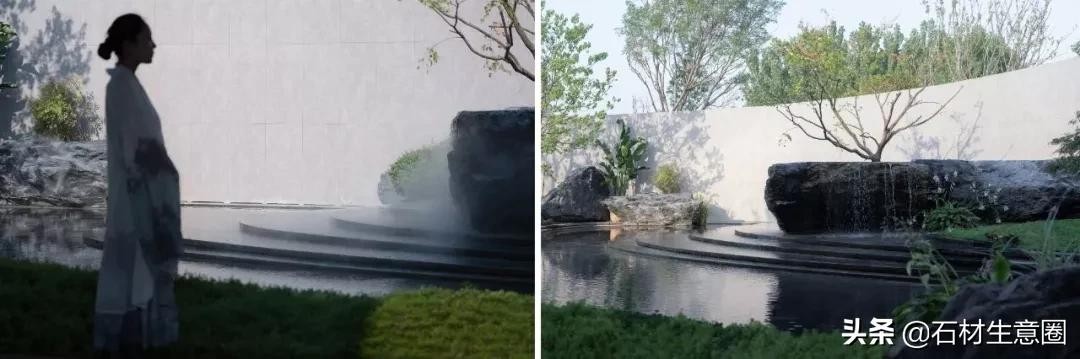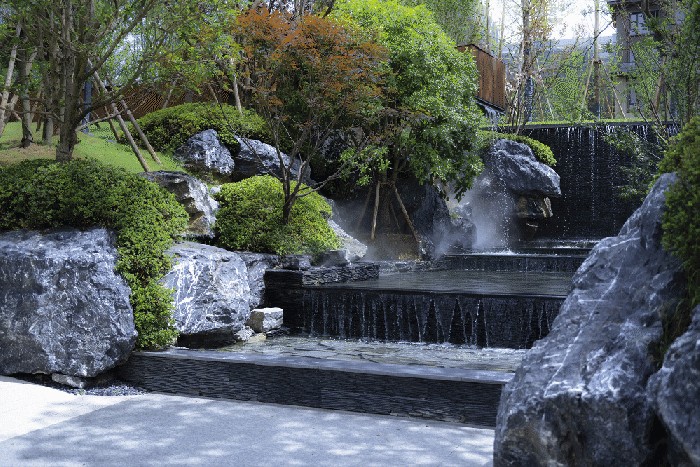 跌水成瀑,连接云海与山脊。层层跌瀑中弥漫的水雾,是朦胧的幻境,成为游历山涧的梦幻起点。选取黑山石原石,模拟自然的笔墨有序堆砌,狂野融合水的柔美。