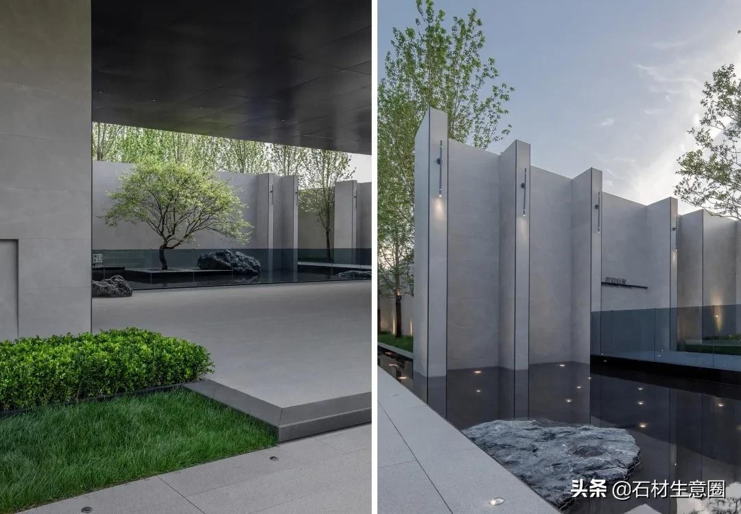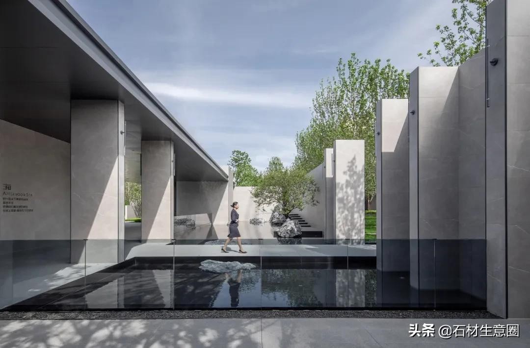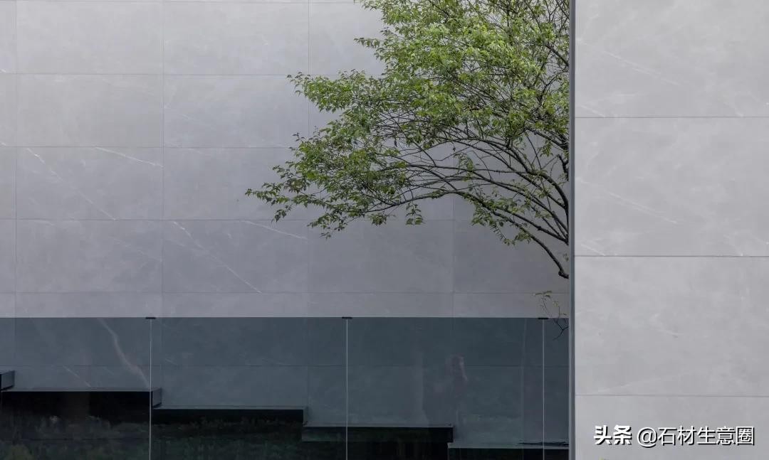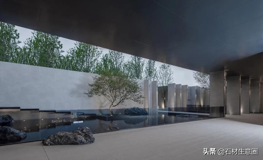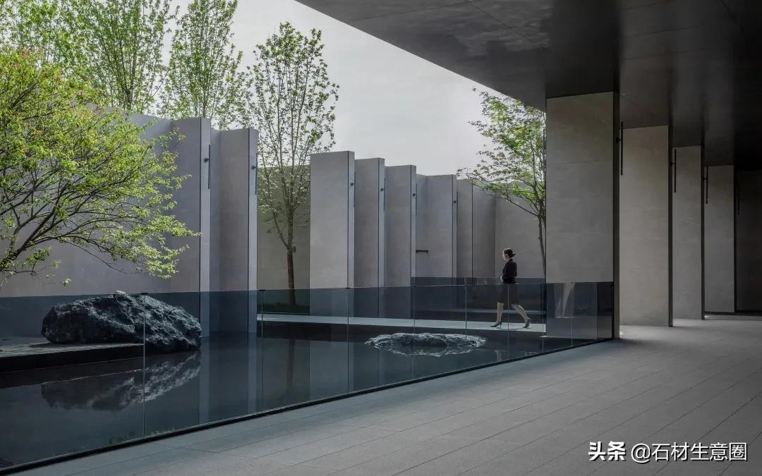 门廊悬空形成灰空间,灰色玻璃栏杆延伸横展,将迎宾场景拉展成超长的横框画卷。礁岸巨石与点景红梅,很好的提升了迎宾空间艺术氛围,演映生活的仪式感和艺术感。