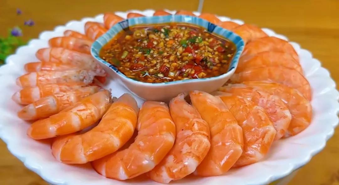 4、虾肉只要煮到全身变得通红,就说明已经熟了,然后出锅摆放在盘中。中间再放上准备好的蘸料,一道非常好吃的白灼虾就做好了。
