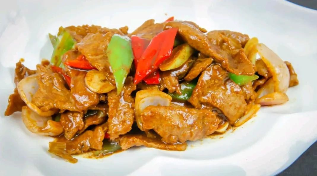 3、倒入葱姜蒜煸出蒜香味,然后从锅边淋入料酒,倒入牛肉片、青红椒和洋葱,加入老抽,生抽、耗油,白糖,鸡粉。胡椒粉,开大火快速翻炒,勾入一点水淀粉,收一下汤汁,淋入芝麻香油,拌匀后就可以出锅装盘好了。
