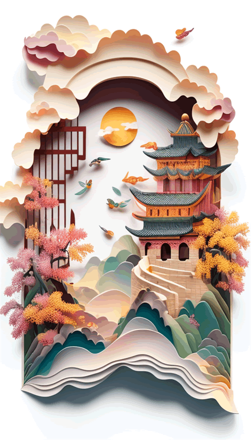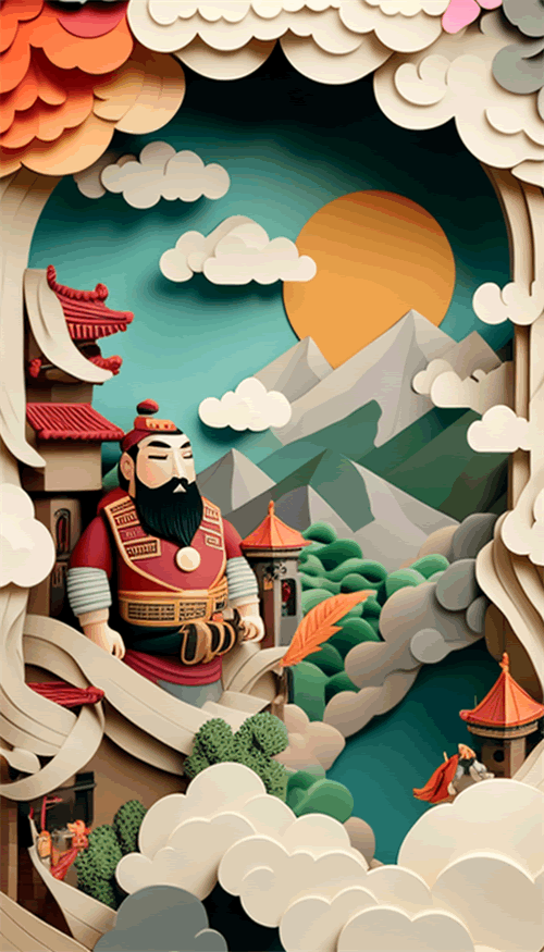 dimensional paper kirigami craft, paper illustration, Chinese illustration on white background, Looking down from the air, Kong Ming in The Romance of the Three Kingdoms, playing the zither on the city wall, surrounded by clouds, above super wide angle, Thomas Kinkade, dreamy, 4K, romantic, trending on Artstation, colorful vanilla oil, 3d relief,Movie Lighting。