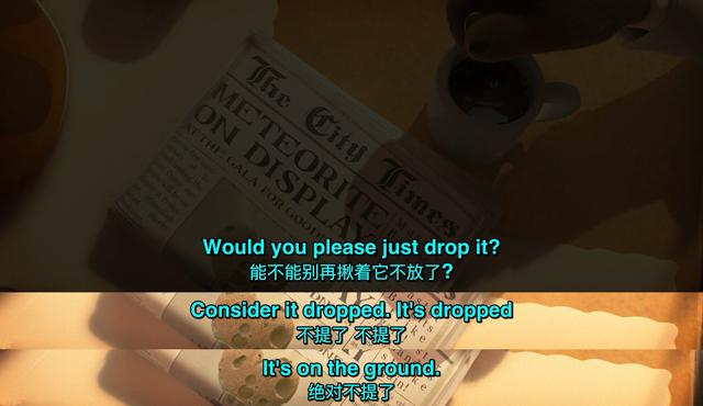 字面意思的drop it,就是把它掉下去,扔掉它。狼先生顺着说:it's dropped, it's on the ground. 就是 “已经扔了,扔到地上了”,以此来表示:嗯,不提了,这事儿我已经扔得远远儿的了。