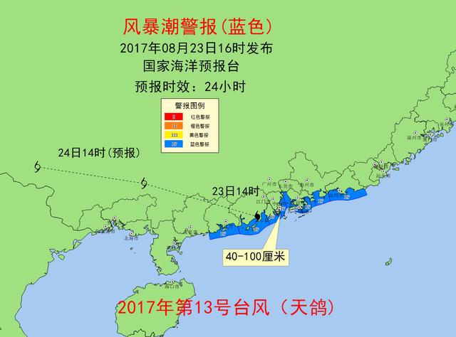 风暴潮方面,预计8月23日夜间到24日上午,广东汕尾到阳江沿海将出现40到100厘米的风暴增水。上述岸段内的潮位站将不会出现达到当地蓝色警戒潮位的高潮位。风暴潮预警级别为蓝色。
