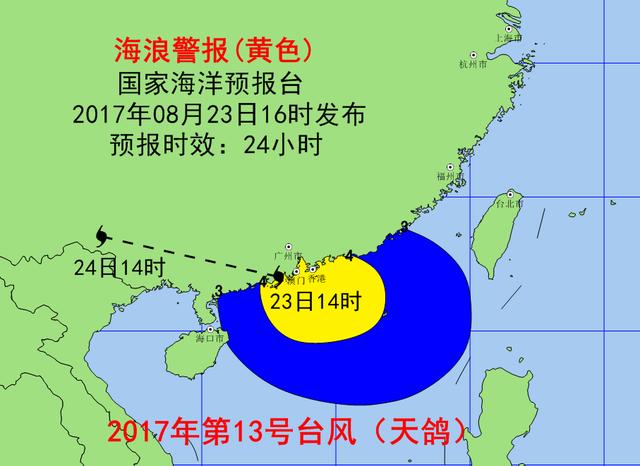 受 “天鸽”的影响,预计8月23日夜间到24日早晨,南海北部将出现3到5米的大浪到巨浪区,广东沿岸海域将出现2到3.5米的中浪到大浪。海浪预警级别为黄色。