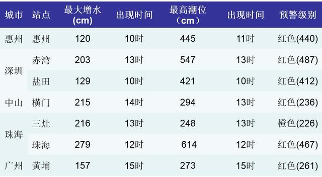 受“天鸽”的影响,珠江口沿岸普遍出现超过120厘米的最大风暴增水,其中珠海站出现了279厘米的最大风暴增水。惠州、盐田、赤湾、横门、黄埔和珠海潮位站出现达到当地红色警戒潮位的高潮位,其中深圳盐田、赤湾、广州黄埔及珠海潮位站最高潮位破历史记录。