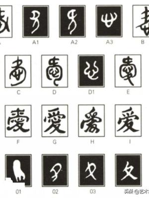 爱,在甲骨文里没有发现,直到战国时代,才开始在一些器皿上(图A、B)、和战国印(图C)里发现这个“爱”字。由“欠”(或“旡”)和“心”两部分构成。“欠”(图A1)和“旡”(图A2)都是端坐地上张着口的人形,“欠”的口”朝左,“旡”的口朝右。这个张口的人,用右手抚着心(图A3,图D1)以表示“张口告人,心里喜欢”的意思,这就是“爱”这个会意字,图(D)的小篆继承了金文(图C)的形体,只是把“欠”变为“旡”了。但秦始皇并吞六国以后统一使用的(图E)的小篆“爱”,字脚却多了一只向下的足(夊),以表示“爱”是一种行为与行动,反而把字繁化了。这个向下的脚即“夊”的演变流程,图01-04的形体,是一只向下的脚逐渐由实化变成线条化、笔画化。因为脚趾向下,所以表示由远而近的行动。这个“夊”不单独成字,后来作为“冬”、“处”、“各”、 “夏”等字的表意符号。
