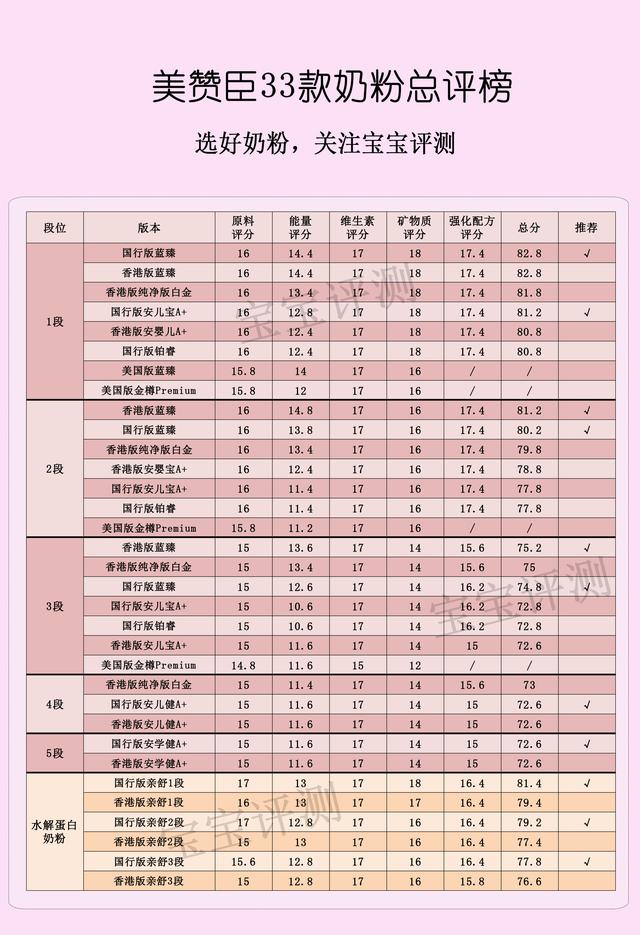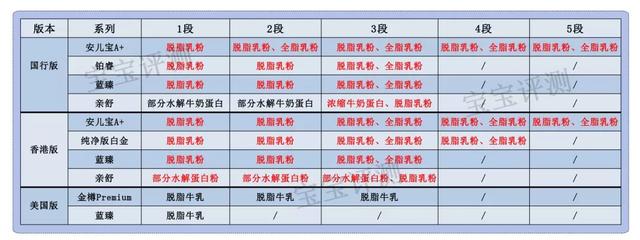 整体:香港版和国行版的蓝臻各段表现均不错,得分较高,可推荐;国行版铂睿各段表现较差,得分较低,不推荐;美国版奶粉部分强化配方数据未标注,不推荐;水解蛋白奶粉更推荐国行版。