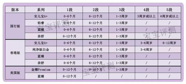 在段数量高划分上,美赞臣国行版美赞和香港版多数划分为1-3段,安儿宝A+系列划到了5段。而美国版蓝臻只有1段,金樽Premium奶粉1、2段的适用年龄划分也比较特殊,家长需要特别注意一下美国版量高。具体情况如下图。