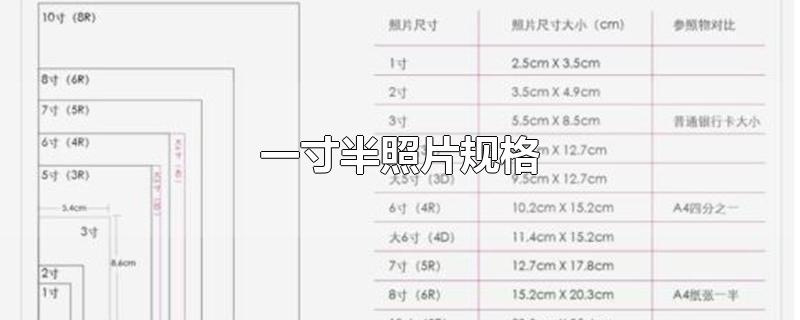 一寸半照片的规格尺寸是3.3cm×4.8cm。照片尺寸的单位一般是英寸,1英寸≈2.54厘米,一寸半的照片通常被称为大一寸。采用一寸半的照片的例子有中国护照和旅行证等, 头部宽度为1.5cm-2.2cm,头部长度为.28cm-3.3cm。
