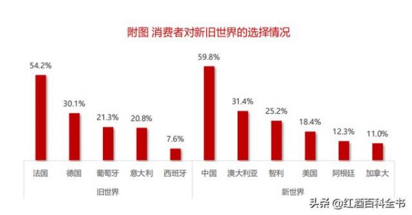 在葡萄酒的众多产区中,新旧世界的差距正在逐渐缩小,虽然法国葡萄酒的地位依然难以撼动(有 54.2% 的消费者会选择喝法国酒),但其他旧世界产区与新世界产区则不分伯仲。不仅如此,调查中还有接近 6 成的消费者会选择喝国产葡萄酒,这也说明国产葡萄酒正在崛起。