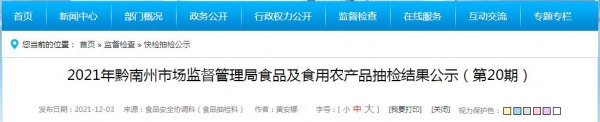 中国质量新闻网讯 12月3日,贵州省黔南州市场监管局网站公示2021年第20期食品及食用农产品抽检结果。本次对辖区内的食品、食用农产品开展抽样检验,共抽检451批次,合格437批次,不合格14批次。