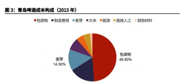 另一方面,在啤酒厂商的成本占比中包装物和制造过程占据了绝大部分。根据光大证券发布的《啤酒及饮料行业跟踪报告》显示,2013年青岛啤酒产品的成本构成中。包装物和制造过程成本占比达到了近65%,远超麦芽糖和大米的22.8%。因而瓦楞纸、玻璃、铝等包装材料价格变动对成本影响同样巨大。