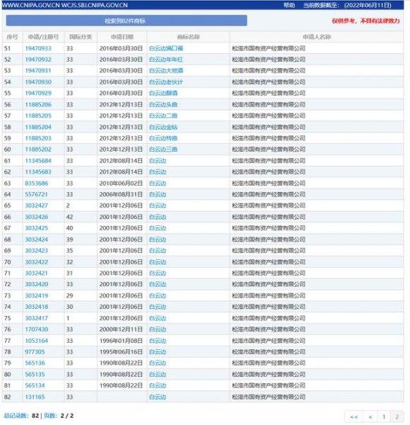 在松滋市国有资产经营有限公司的82条“白云边”相关商标中,有71条商标国际分类为33类-酒类。