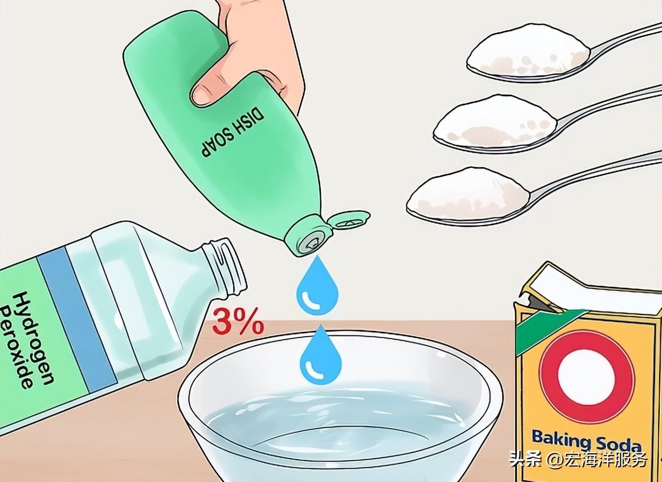 1、调配双氧水溶液来去除尿渍。干了的尿渍仍然去得掉!将240毫升的3%双氧水、3汤匙(40克)小苏打和2滴洗碗剂倒入一个小碗混匀。用勺子将所有材料拌匀。