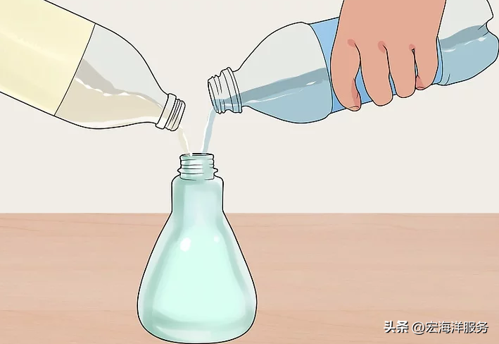 3、将等量的白醋和水倒入喷瓶里混匀。直接将水和白醋倒入喷瓶。使用你可以找到的最大喷瓶,因为你可能需要用到很多醋溶液,具体取决于尿渍的面积。