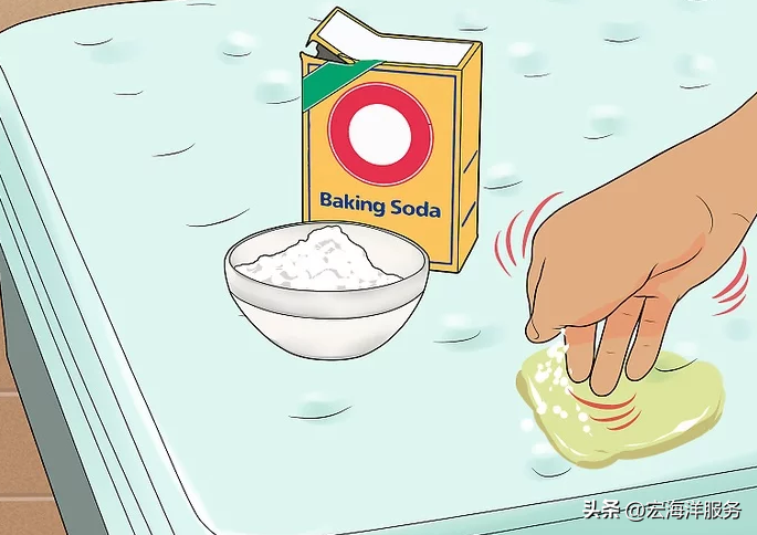 6、在整个床垫撒上小苏打。将大量小苏打撒在床垫上,覆盖的面积越大越好。这样也有助于消除其它异味。