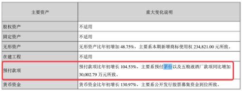 华致酒行的半年报显示,截止到2019年6月30日,华致酒行的预付款比年初增长了104.53%,主要是预付以及五粮液酒同比增加了3亿元。