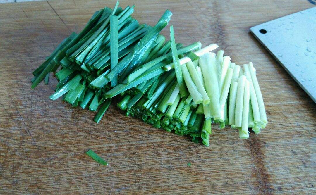 1.首先准备鸭血一盒,然后给它切成厚厚的薄片。放在清水中,给它冲洗一遍。新鲜的韭菜一小把给它切成三厘米左右的长段。