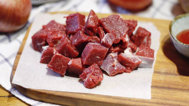 1.首先准备新鲜的西红柿两个从顶部切一个花刀,然后给它切成厚厚的薄片。最后切成小丁放入碗中备用。牛腩一块切成厚片,最后给它切成小块。
