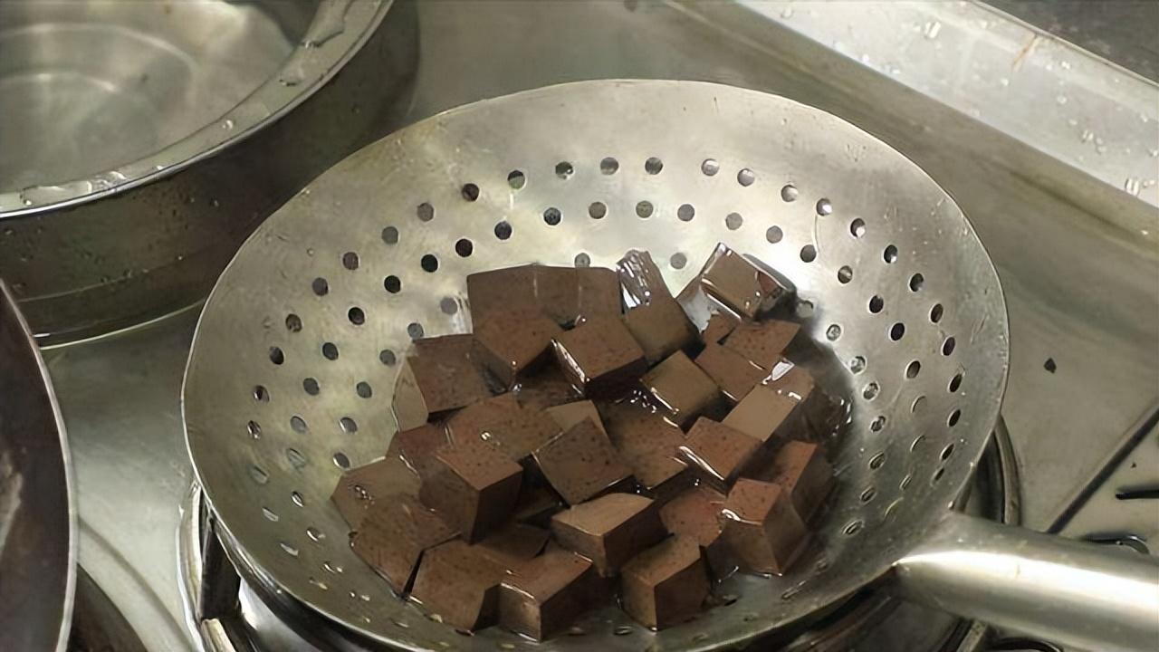 2.炒锅内加入适量的清水大火烧开,水烧开后把准备好的鸭血放进去,汆烫20秒后立即捞出。放入冷水中空凉。