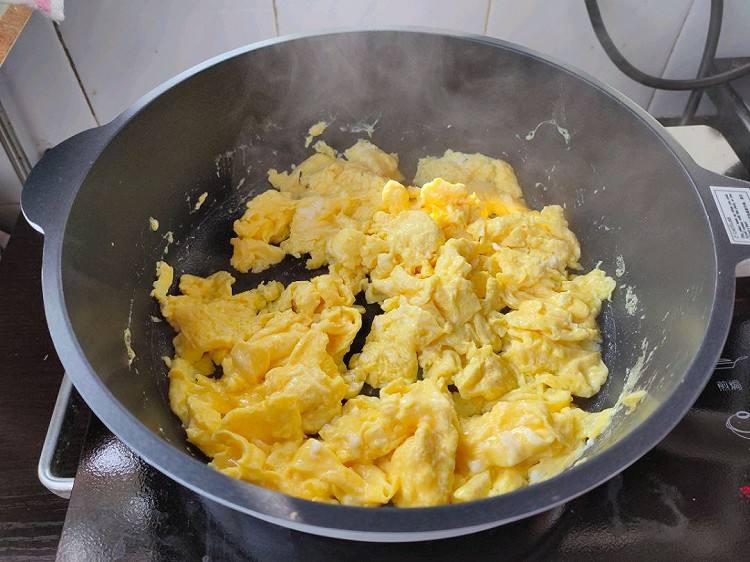 2.炒锅内加入适量的食用油,油热后把准备好的三个母鸡蛋打入锅内。用筷子给它翻拌均匀。翻炒熟透后捞出放入碗中备用。