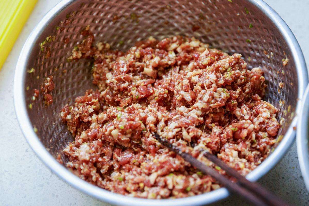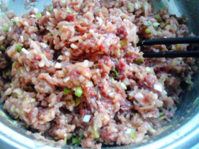 3.腌制好的肉馅往里面倒入切好的白瓜,放入一勺食用油用筷子搅拌均匀。面团分成大小均匀的剂子,然后把这个肉馅包裹起来。做成饺子的形状。
