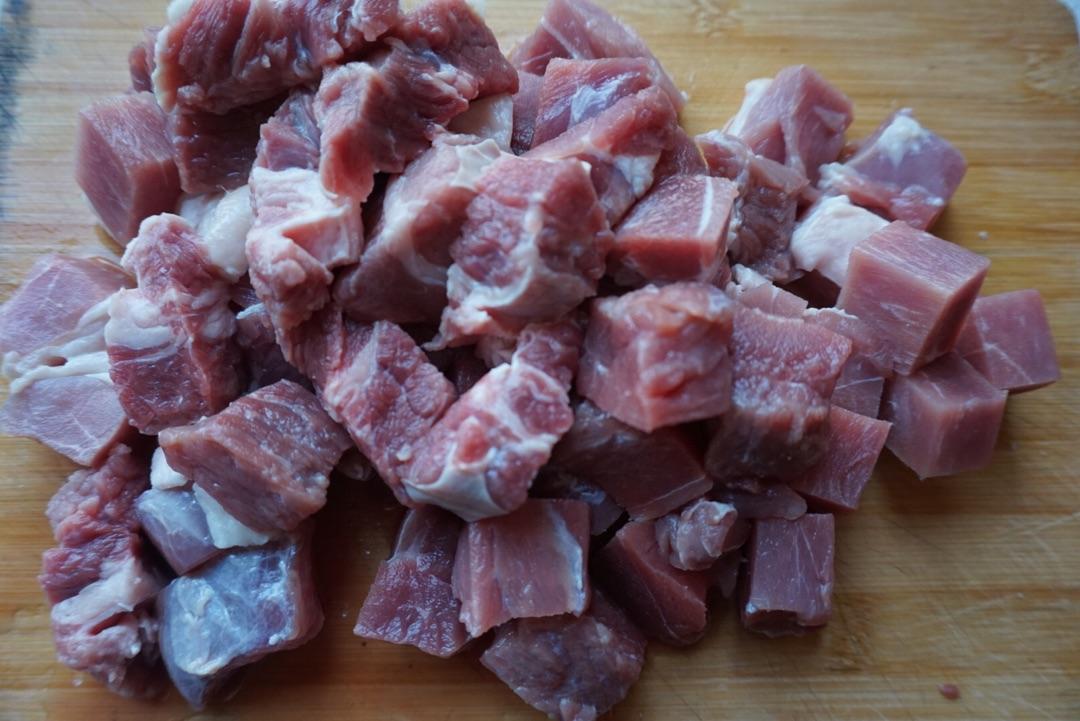1.首先准备新鲜的白瓜500克,去掉外皮。然后给它切成厚厚的薄片。最后切成小块放入碗中备用。猪里脊肉一块切成厚厚的薄片,最后给它切成肉丝。然后剁碎放入碗中。