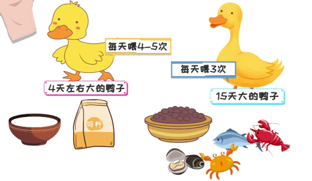 3、15天大的鸭子:15天后每天喂3次即可。雏鸭开食3天后,需增加动物性蛋白饲料,将小鱼虾、河蚌、螃蟹、蚯蚓等剁碎与食料拌在一起喂给。