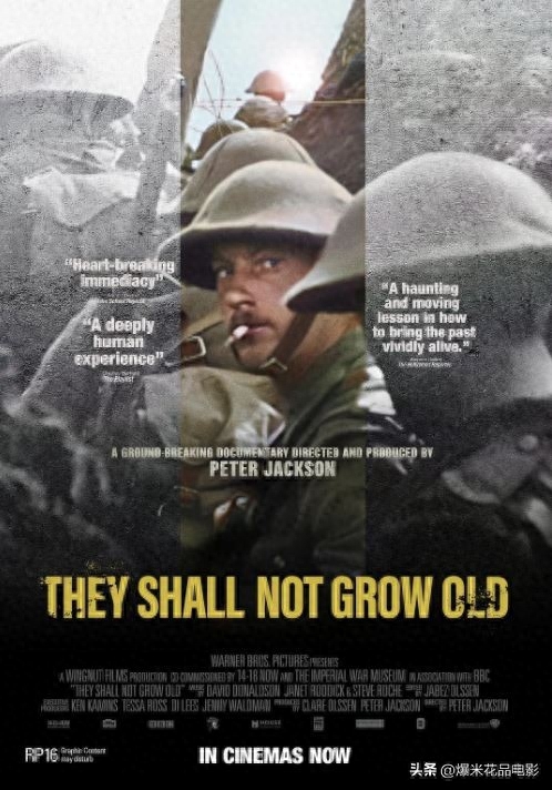 在彼得·杰克逊充满活力的纪录片《他们已不再变老》中,第一次世界大战以一种人类从未见过的方式被展示出来。杰克逊和他的技术奇才用彩色的方式向观众介绍这场战争,杰克逊的团队利用他们能得到的任何可用的视频片段,将图像转换成醒目的绿色和蓝色以及介于两者之间的颜色,在那里,战争的泥泞和污秽从未如此令人厌恶,战争的鲜血从未如此深红色。更重要的是,在这些令人惊叹的图像上播放了来自英国军人的采访(由BBC和帝国战争博物馆提供)。一些配音和音效完善了这一体验,其目的是通过一堂独一无二的历史课,直接从在场的男性那里重振这场冲突。