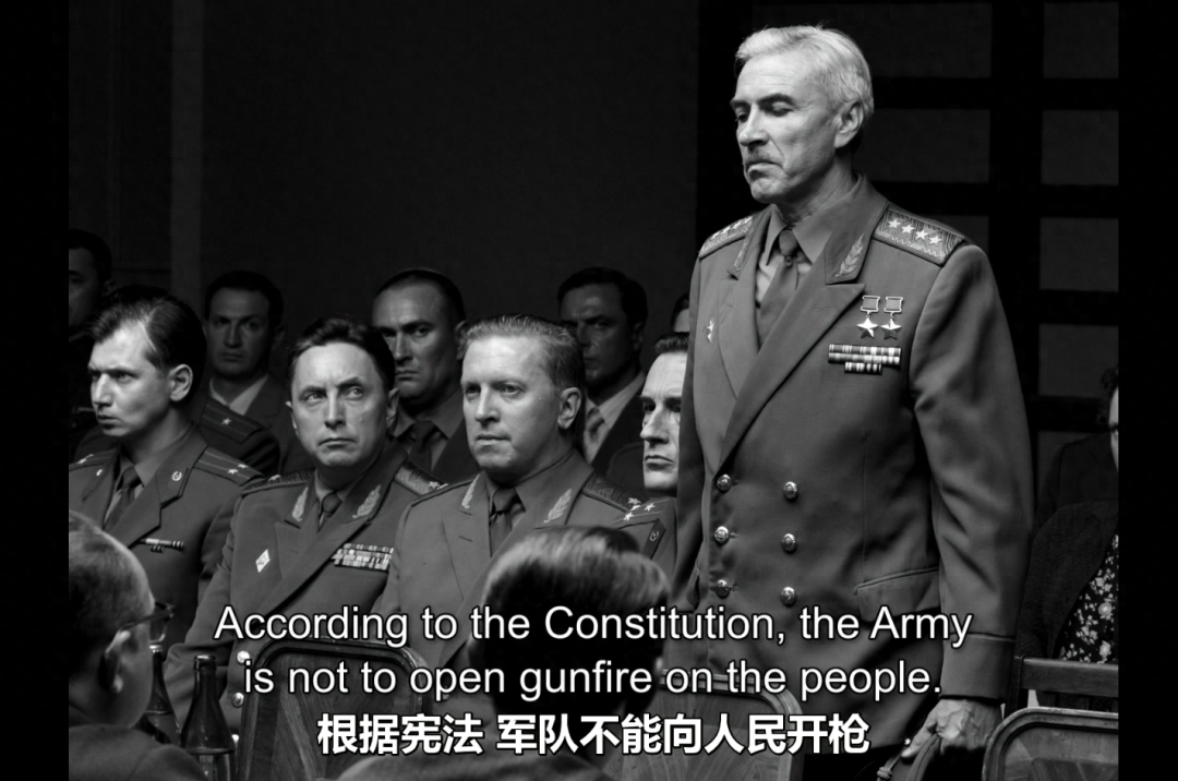 这场突如其来的枪杀,不但让聚众的工人和围观的人群措手不及,也让前苏联政府中的一些高层备感错愕。诚如片中的一位军方高官所说,军队的目标是保卫祖国,抵御外敌,而不是将枪口对准普通百姓。