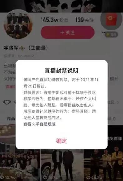 目前宇将军的KS账号直播暂时被封禁了2天!