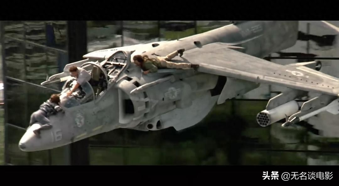 电影出场的战斗机——“AV-8B鹞式战机”,机身前后的4个可旋转喷气口使其成为世界第一种可垂直起降的战斗机!