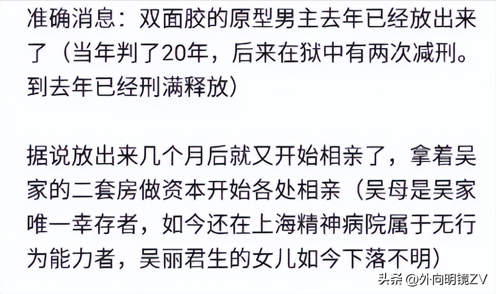 女主胡丽娟的原型是上海姑娘吴丽君,被丈夫重击太阳穴之后被掐死。她的父亲受不了打击,心肌梗塞去世。她的母亲,精神失常,现在还在精神病院。