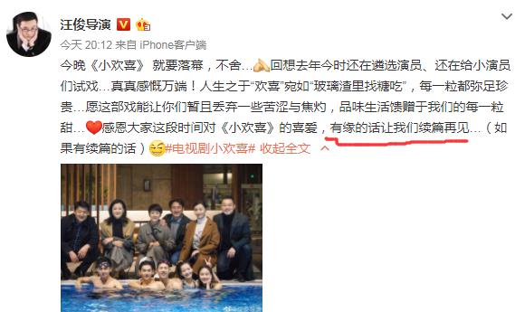 《小欢喜》这个IP是从《小别离》延伸过来,两部剧同一天收官,也是一种缘分。《小欢喜》导演汪俊在大结局前晒出《小欢喜》中三家的合影,并附文”有缘的话让我们续篇再见“。