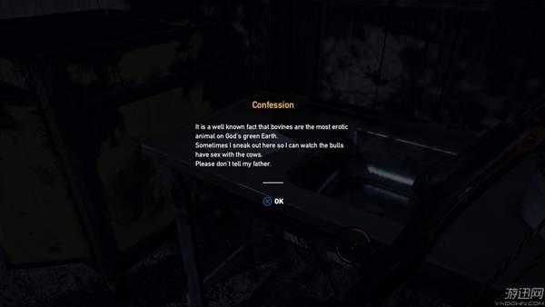 在《孤岛惊魂5》中就有一个Davenport农场,在农场中可以找到一张纸条,是这样写的:“众所周知啊,牛是这个地球上最色情的动物。有时候我会从这里溜出去,看公牛和母牛之间交配。请别告诉我的父亲。”